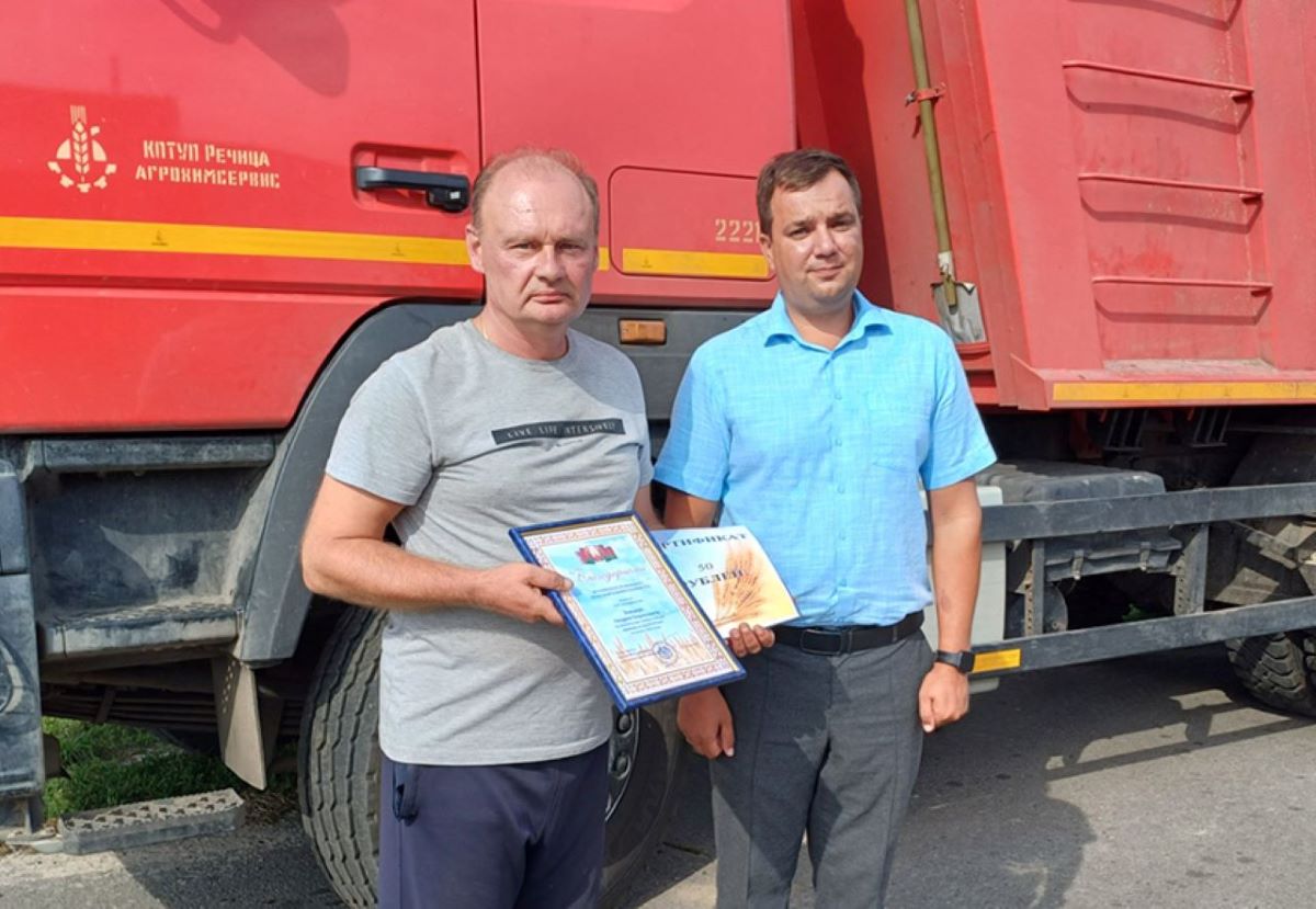 К поздравлениям присоединились заместитель начальника управления сельского хозяйства и продовольствия Брагинского райисполкома Евгений Ясинский совместно с председателем отраслевого профсоюза Людмилой Дубина. Они отметили труд Андрея Бондаря (перевёз 1020 тонн зерна) из ОАО «Комаринский» и Сергея Ларченко (перевёз 1039 тонн) из ОАО «Брагинка».