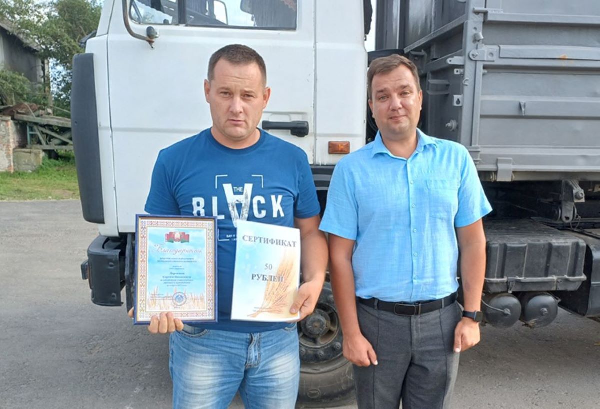 Поздравления, благодарности и сертификаты от председателя райисполкома Сергея Карпенко сегодня получили многие. Экипаж Андрея Гуза и Александра Новика из ОАО «Пераможнік» намолотил 1050 тонн зерна. Их коллега Николай Дорощенко намолотил 1012 тонн, а Сергей Котляренко – 1005. Водитель Александр Музыкин, работающий в КЖУП «Брагинское» и помогающий данному хозяйству на уборочной, перевёз 1446 тонн зерна.