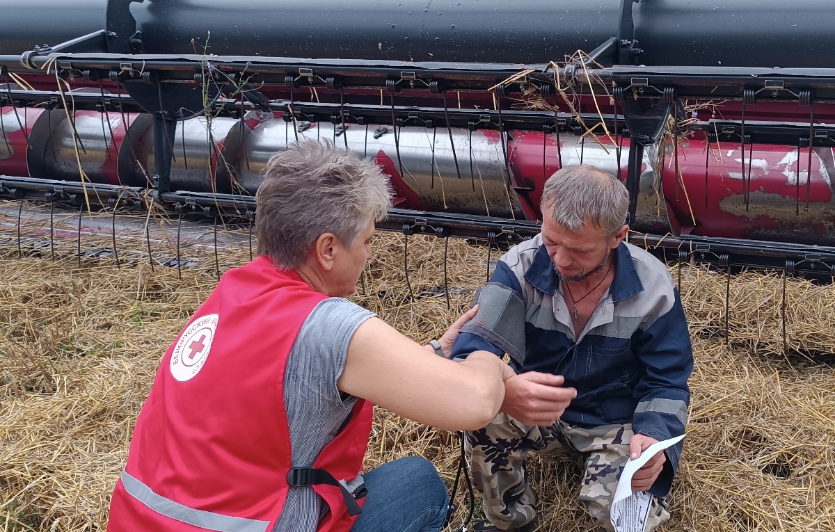 Председатель Чечерской районной профсоюзной организации Белорусского профсоюза работников агропромышленного комплекса Анжелика Кравченко и председатель Чечерской районной организации «Красный Крест» Светлана Смирнова выехали на поля, где трудятся работники КСУП «РовковичиАгро» и ОАО «Вознесенск».