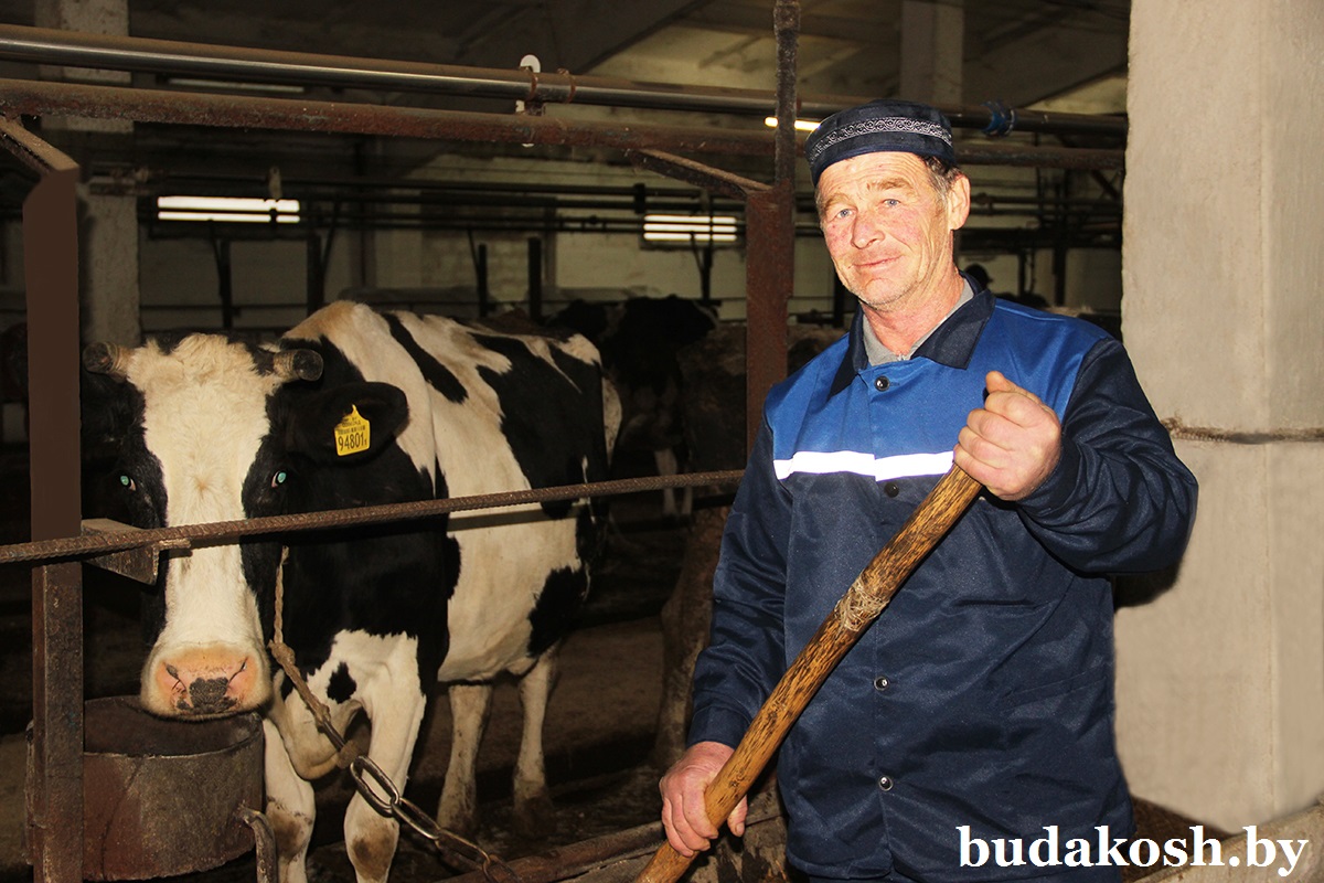 Большой стаж работы в хозяйстве и у Алексея Крюкова – 27 лет. Начинал трактористом, а последние 23 года трудится животноводом по уходу за дойным стадом МТФ-1. Он занимается чисткой кормушек и прохода, отвозит молоко в специальных емкостях на коне Вертолете, доставляет муку, кормит и поит около 100 голов скота.