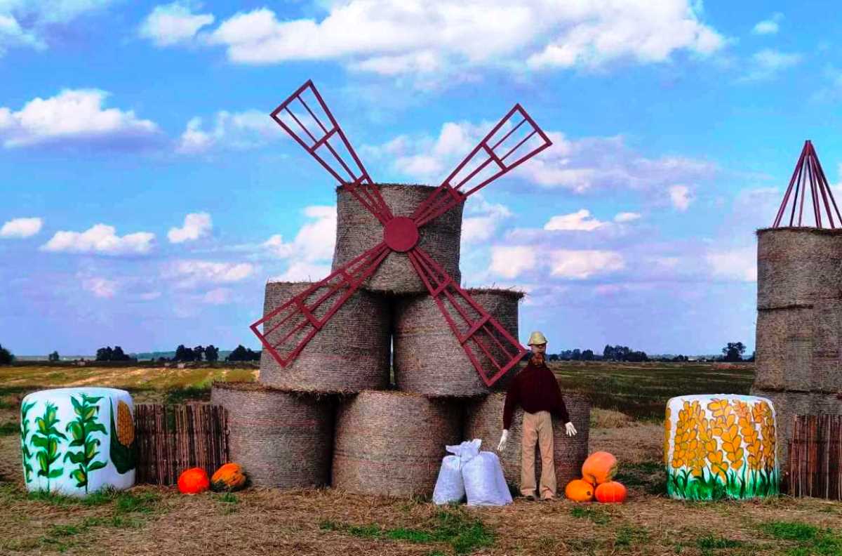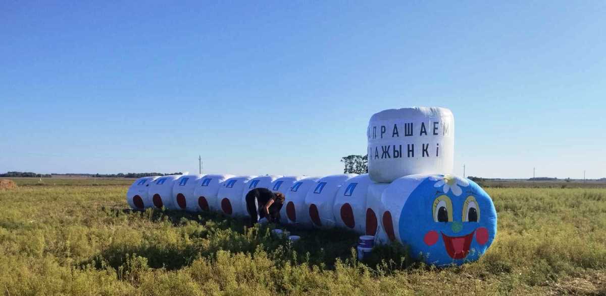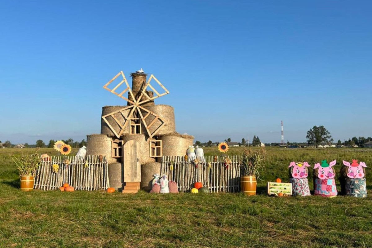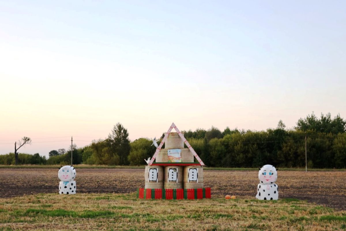 Мешки с зерном, тыквы, розовые свинки и в основе всего – тюки из соломы с деревянной дверью. Такую красоту установили вдоль трассы около н.п. Дубровица.