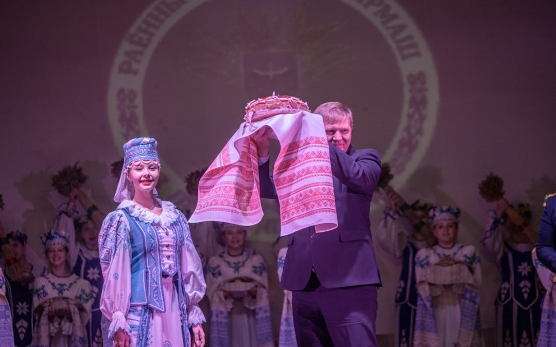 По стародавней белорусской традиции самый бесценный и святой хлеб из нового урожая, как символ завершения жатвы и процветания нашей страны вручён председателю Лельчицкого районного исполнительного комитета Сергею Дылюку.