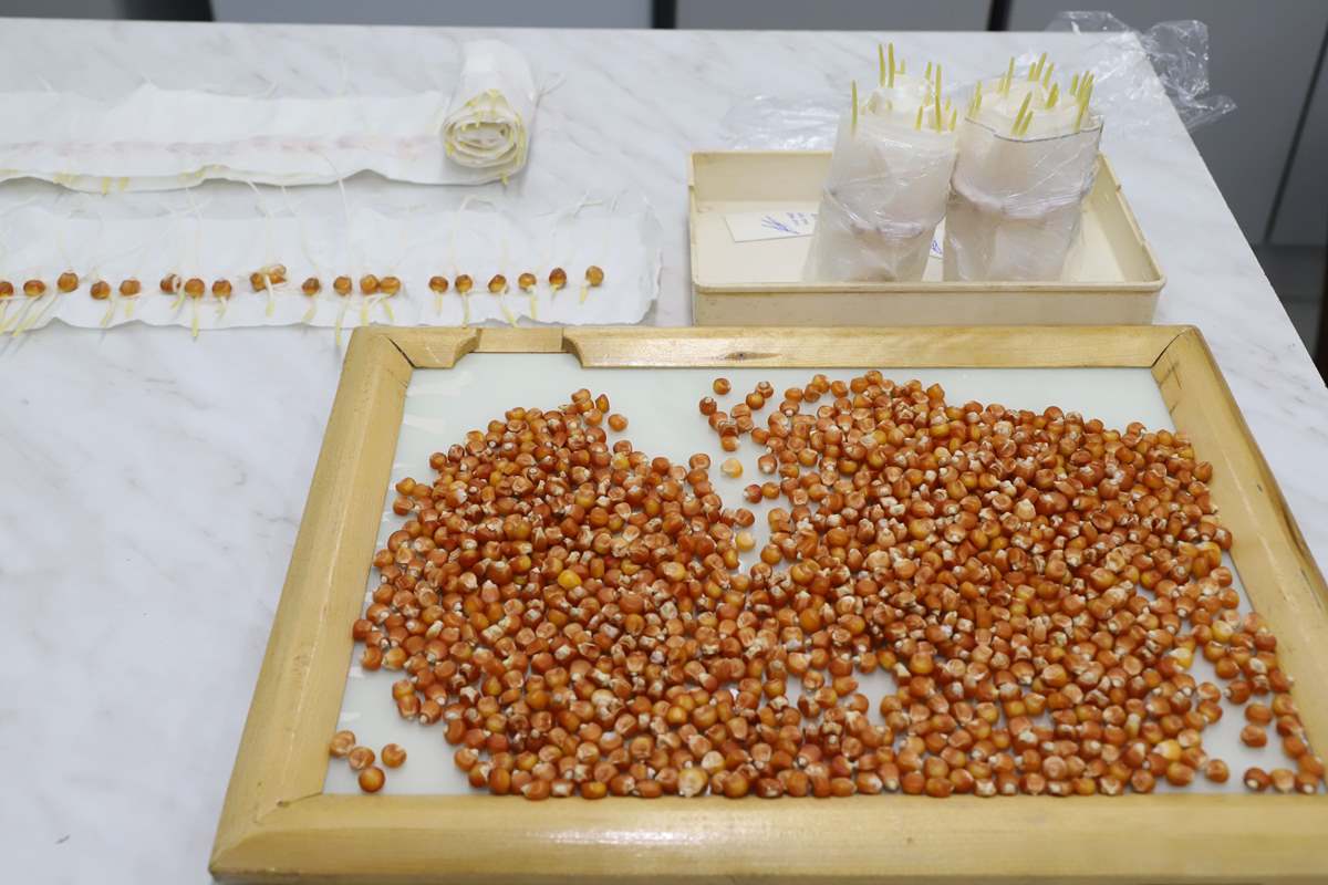 Первым делом лаборанты осуществляют первичный входной контроль – визуальный осмотр початков. Если вопросов по их качеству не возникает, то лаборанты берут образцы и определяют их жизнеспособность, энергию роста, прорастание, наличие трещин, массу тысячи зерен.