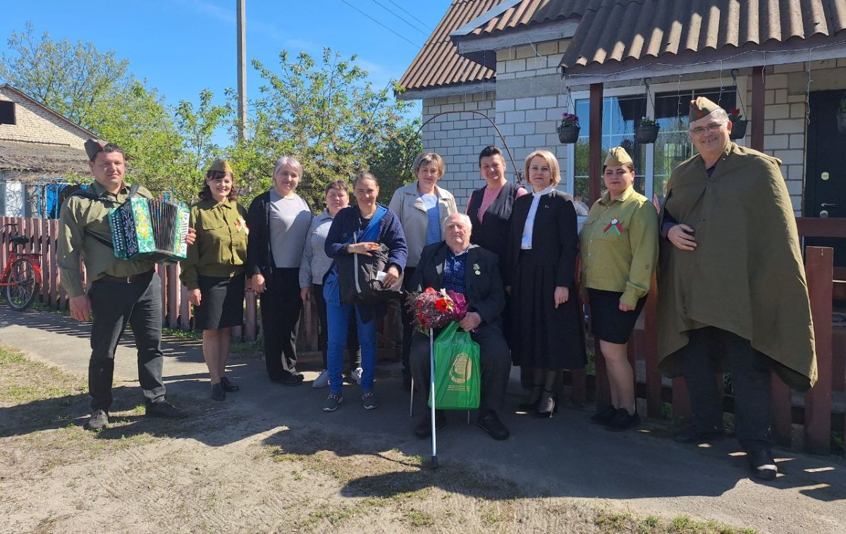Марафон поздравлений с Днем Победы в агрогородке Старое Высокое. Председатель Ельского районного Совета депутатов Оксана Захарченко, председатель Старовысоковского сельского Совета Мария Алесич, председатель районной профсоюзной организации работников АПК Ольга Багинская, представители КСУП «Совхоз «Коммунист» поздравили с наступающим праздником — Днём Великой Победы Александра Барановского.