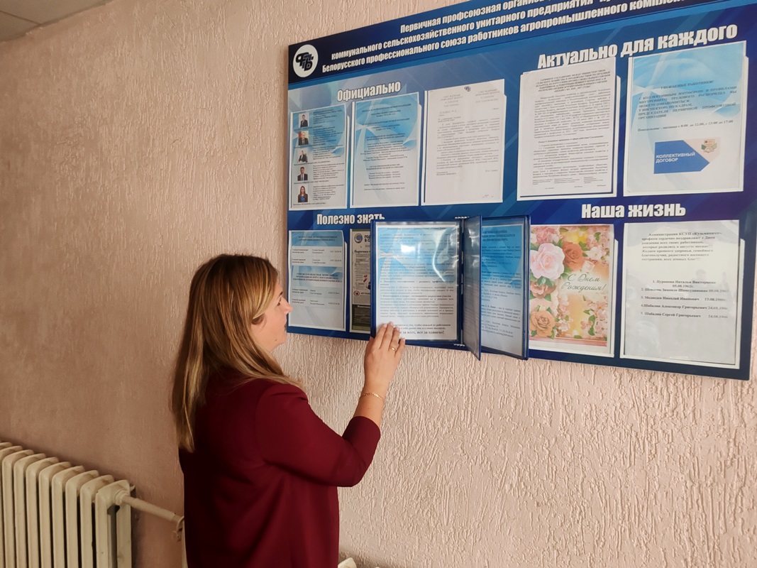 В целях поддержания порядка в работе профсоюзных организаций председатель Добрушской районной профсоюзной организации Белорусского профсоюза работников АПК Ольга Мельникова совместно с главным бухгалтером Ириной Алампиевой посетили первичные профсоюзные организации КСУП «Кузьминичи» и КСУП «Оборона