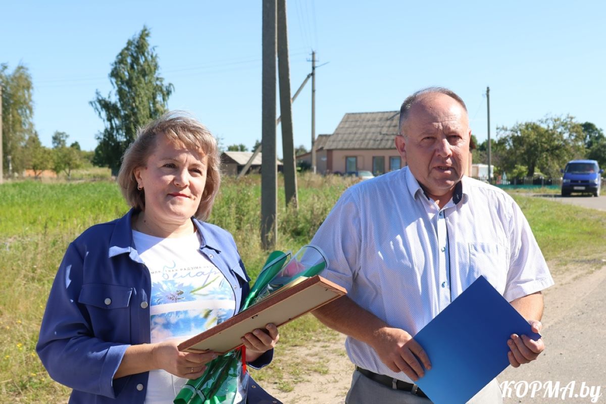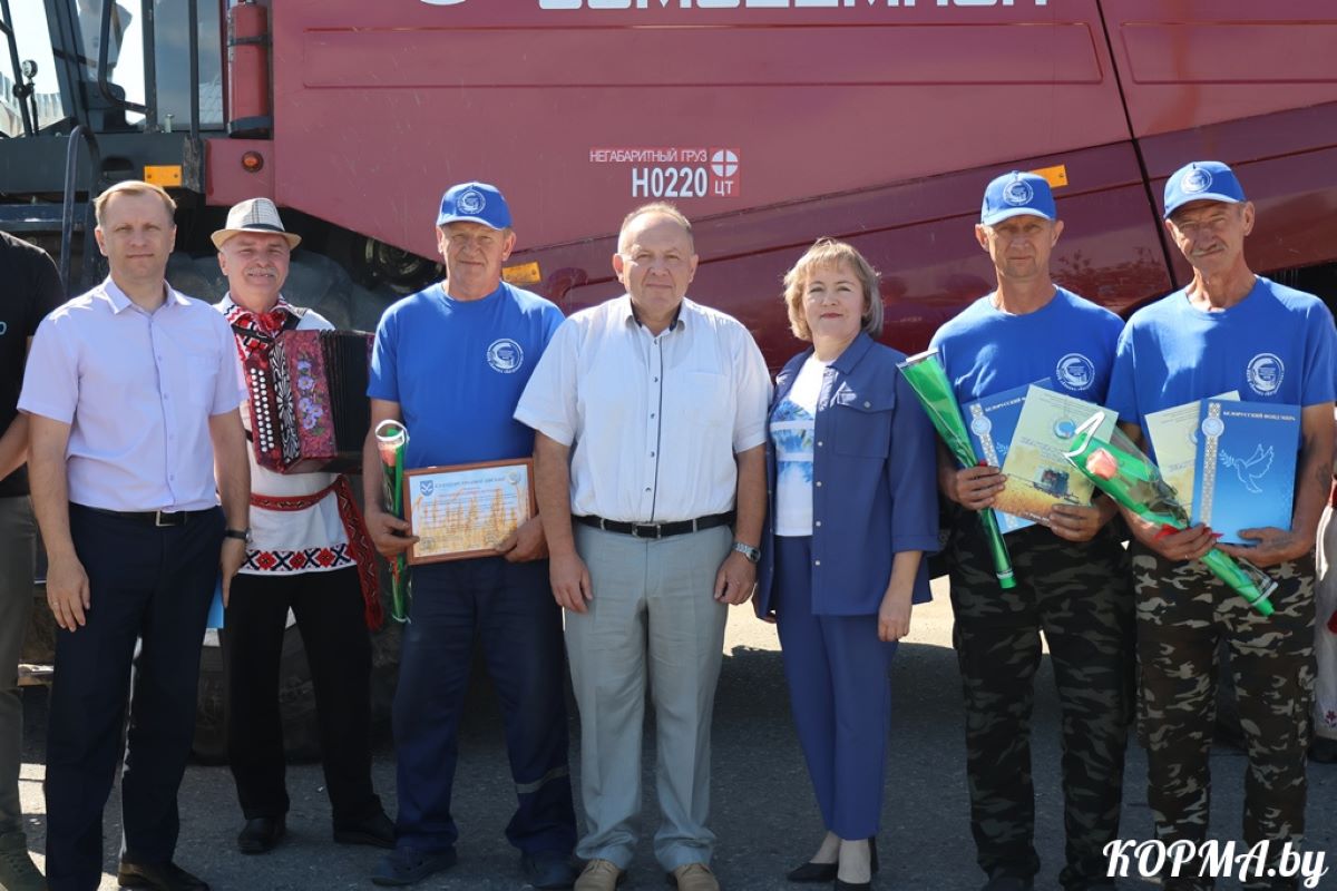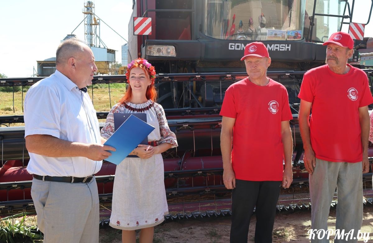 Илья Викторович вручил Благодарности Белорусского фонда мира и денежные премии за достижение высоких производственных показателей на уборке зерна и образцовый мирный труд экипажу комбайнеров Сергею Кучинскому и Александру Костюкову и водителю Владимиру Чикезову, перевёзшему уже две тысячи тонн зерна.