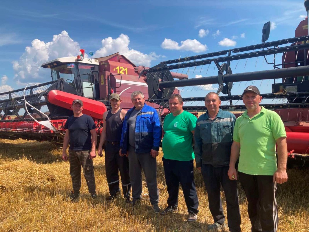 На уборке первого урожая трудятся лучшие работники ОАО «Тихиничи»: Владимир Володькин, Сергей Васильцов, Андрей Маньковский, Михаил Ляхов, Вадим Пилипенко, Александр Борисенко, Евгений Князев, Владимир Дыленок. Виктор Ксензов поблагодарил всех работников за их самоотверженный труд и пожелал им успехов в уборке урожая!