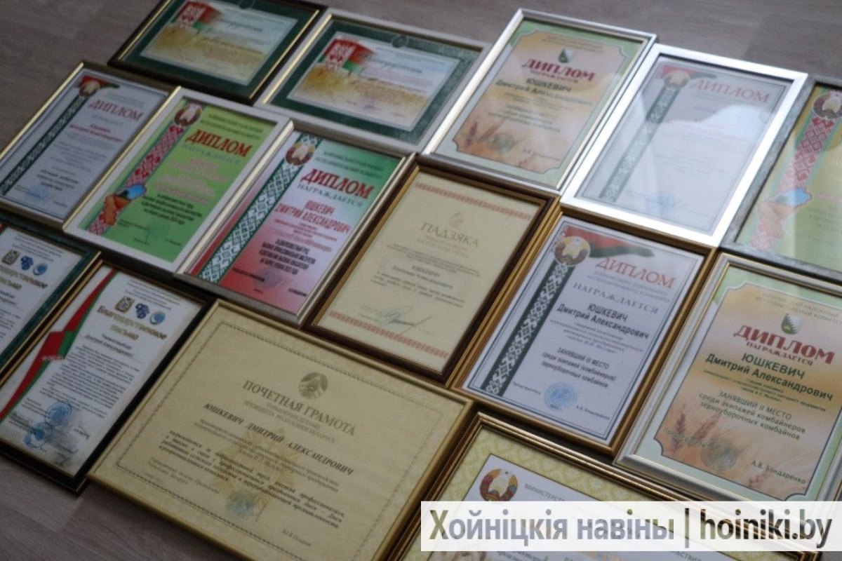 У доме Юшкевічаў кожны куточак напамінае, што тут жыве хлебароб. Падзяк каля 50 штук. Самыя цэнныя для Дзмітрыя ад Адміністрацыі Прэзідэнта і Міністра сельскай гаспадаркі. А з раённых і абласных «Дажынак» (з Кармы і гарадскога пасёлка Акцябрскі) падарункаў не пералічыць – пральная машына, тэлевізары, пылесос, мікрахвалёўка, кававаркі, люстры, посуд. Усяму знайшлі прымяненне.