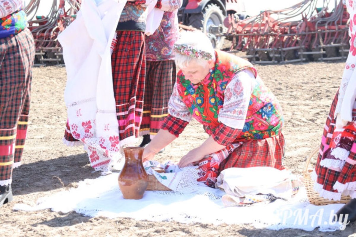 На свежевспаханном поле около деревни Сапожки Кормянского района собрались участники ритуала аграриев — льноводы, артисты, священнослужитель, руководство района, чтобы вместе попросить у Господа Всевышнего и земли-матушки хорошей погоды, исправной техники, благодатного настроения.