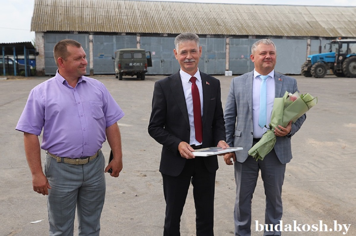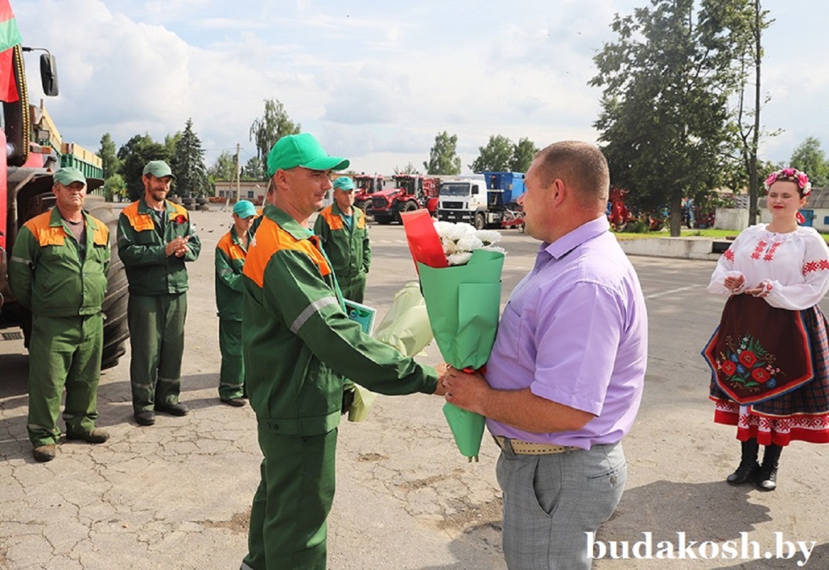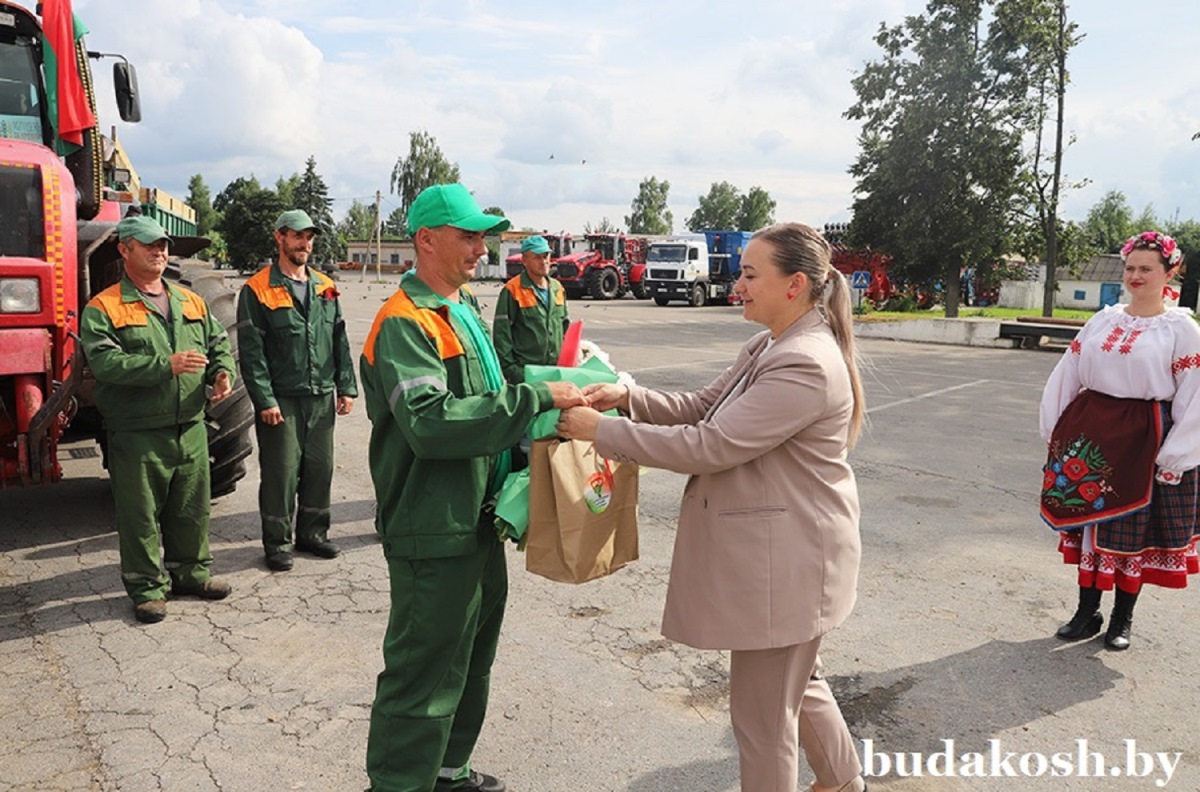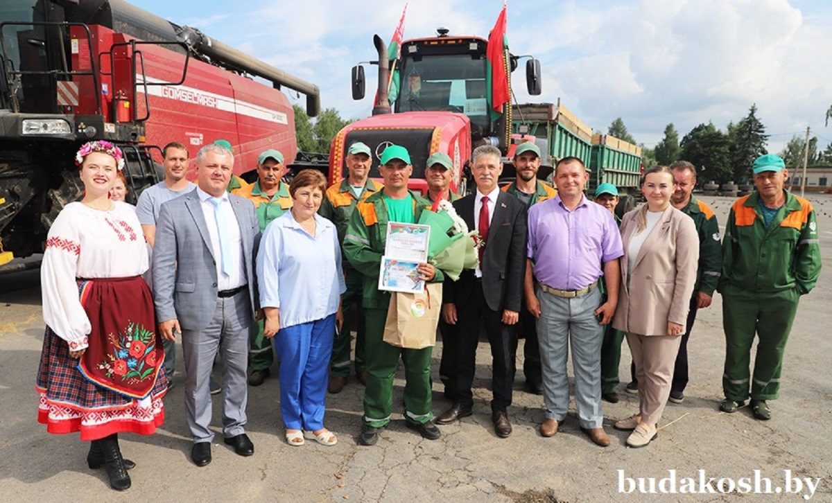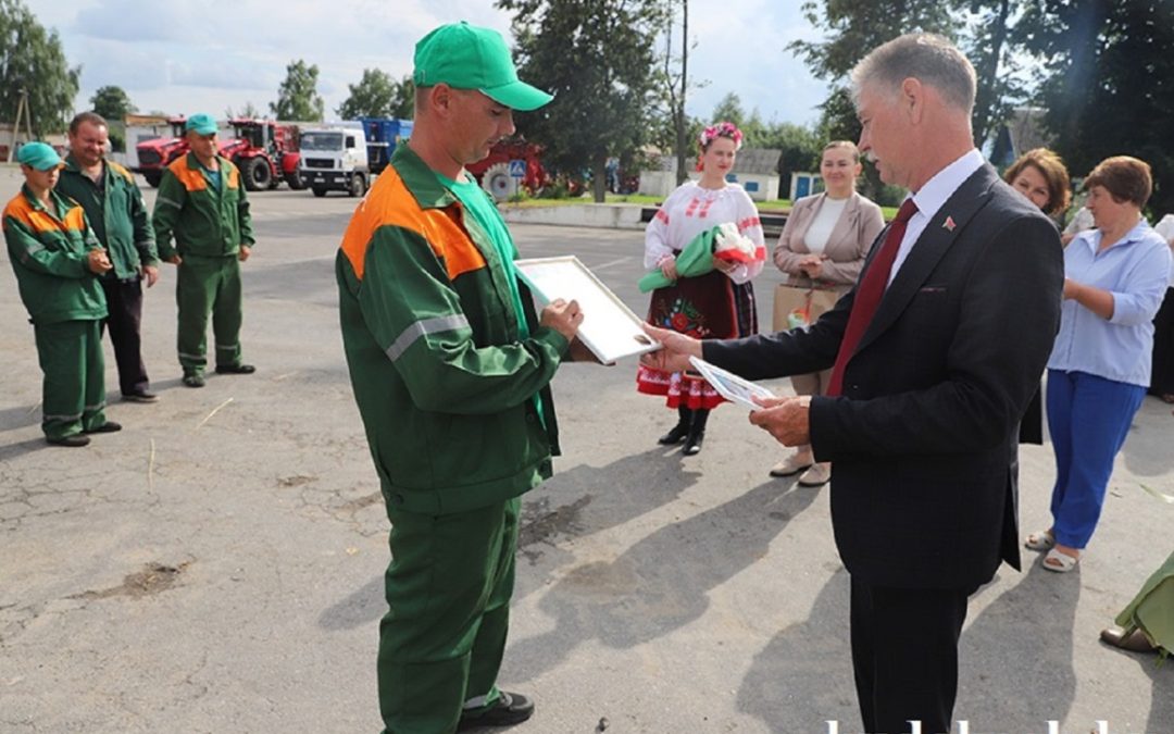 Александр Гриньков отметил, что Дмитрий Лутков первый перевез тысячу тонн зерна в области среди молодых водителей и поблагодарил тракториста-машиниста за работу. От Гомельского областного исполнительного комитета, областного объединения профсоюзов, областного комитета Белорусского профсоюза работников АПК Александр Григорьевич вручил Дмитрию Луткову благодарственное письмо и денежный сертификат за трудовое участие в уборке урожая 2025 года. Со словами благодарности к герою жатвы обратились Александр Ковалев и Татьяна Хацулева.