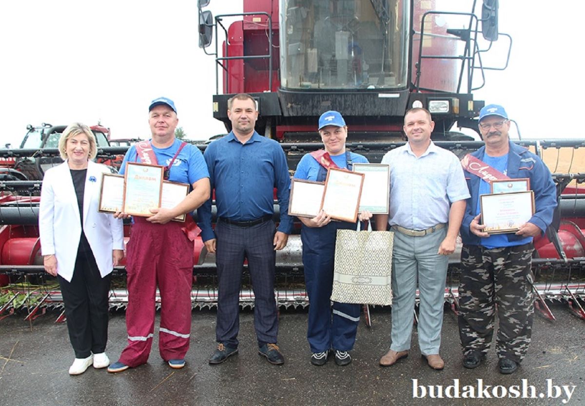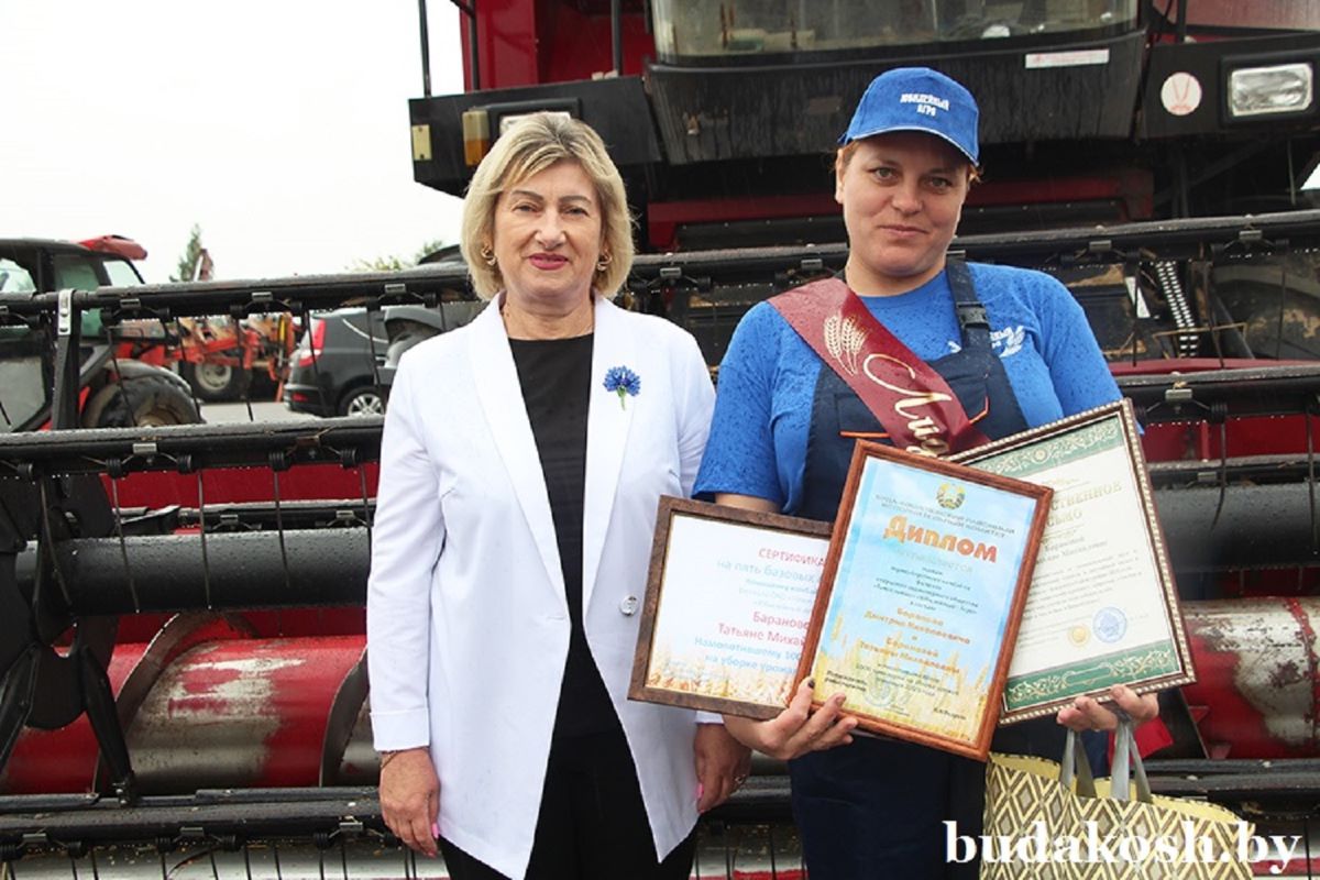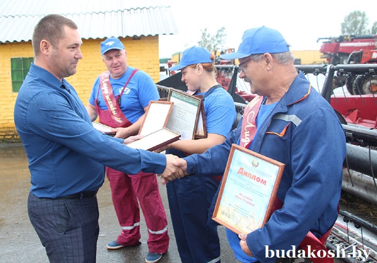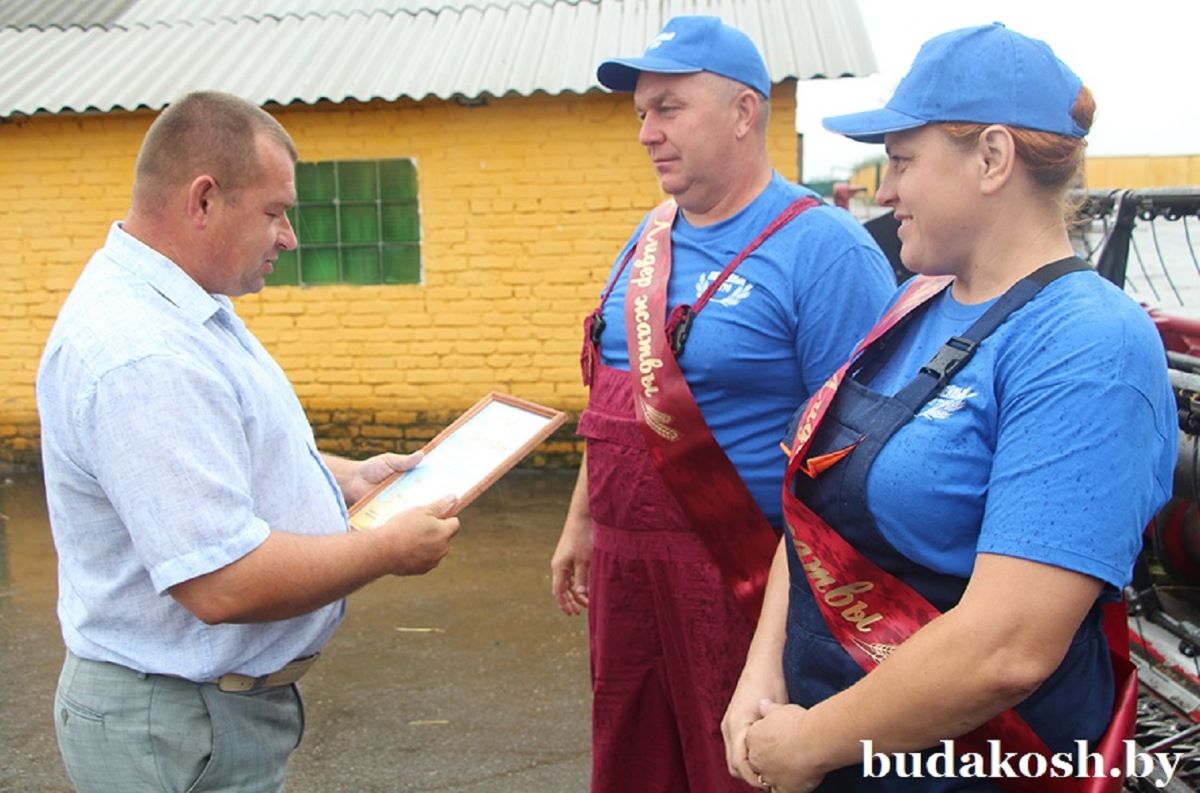 В филиале ОАО «Гомсельмаш» «Юбилейный-Агро» Александр Ковалев вместе с председателем районного ОО «Белорусский союз женщин» Еленой Парфененко чествовали семейную пару комбайнеров Дмитрия и Татьяны Барановых, перешагнувших тысячный рубеж, водителя Юрия Механикова, который перевез свыше 1500 тонн зерна. Александр Викторович повязал хлеборобам ленты лидеров жатвы, вручил дипломы, пожелал крепкого здоровья и успехов в дальнейшей работе. Поздравления прозвучали от Елены Парфененко и директора филиала Сергея Дрозда. Героев уборочной кампании поощрили денежными сертификатами и памятными подарками.
