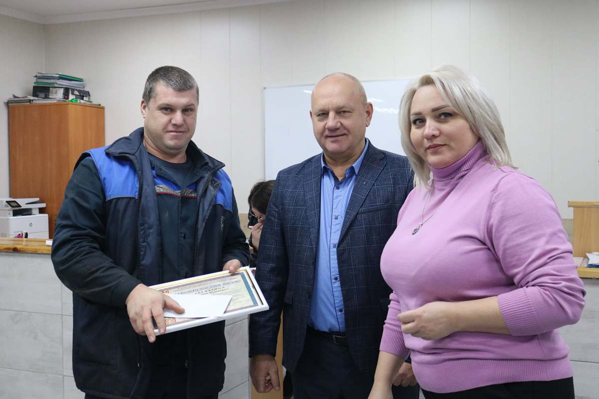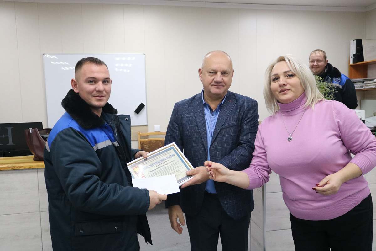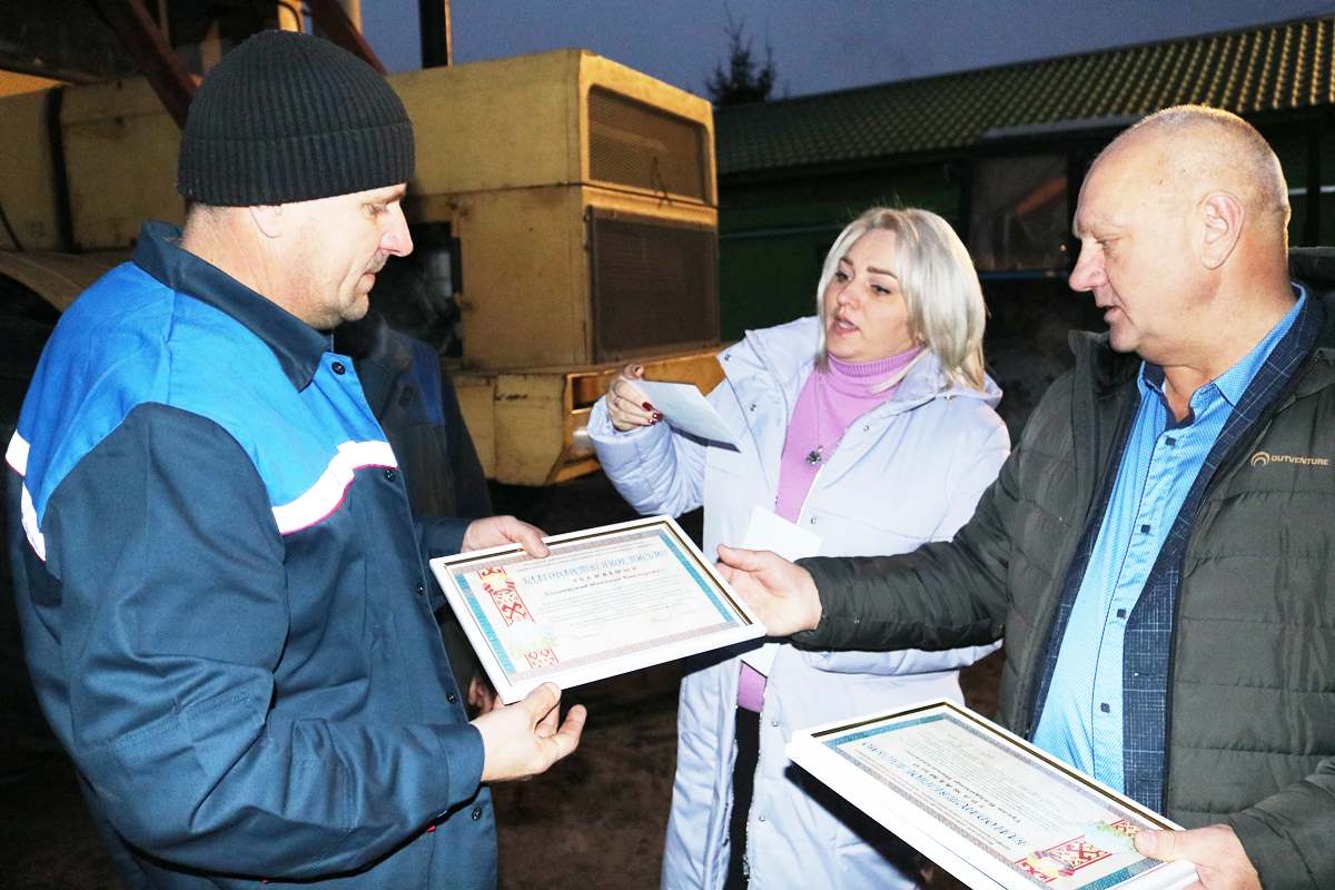 Александр Сергеевич совместно с председателем первичной профсоюзной организации ОАО «Мозырьсоль» Виктором Красюком и заместителем директора по идеологической работе Татьяной Витковской вручили благодарственные письма и денежные вознаграждения 14 механизаторам, среди которых Самир Рзаев, Константин Терентьев, Николай Швед, Владимир Принеслик, Владимир Гусак, Виталий Копылович, Максим Черновец, Дмитрий Бабына, Николай Сасновский, Александр Астапенко, Игорь Школин, Сергей Колосков, Сергей Бондаренко и Сергей Чуб.