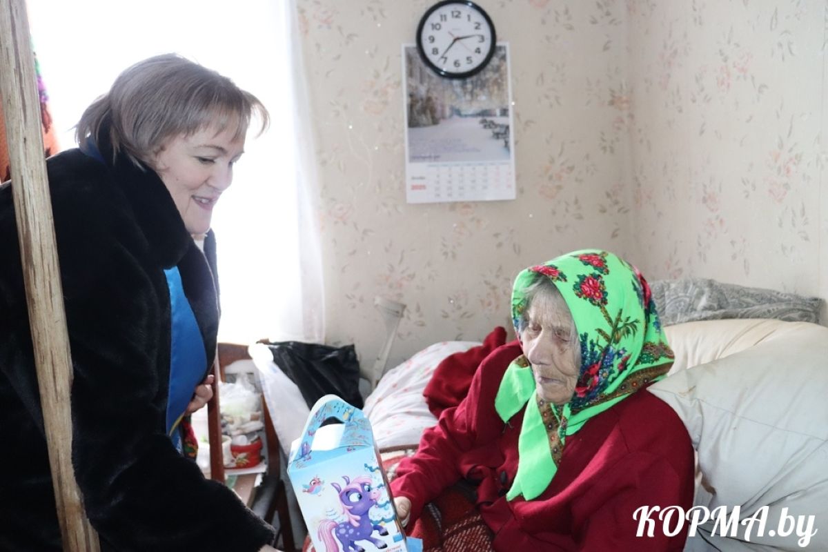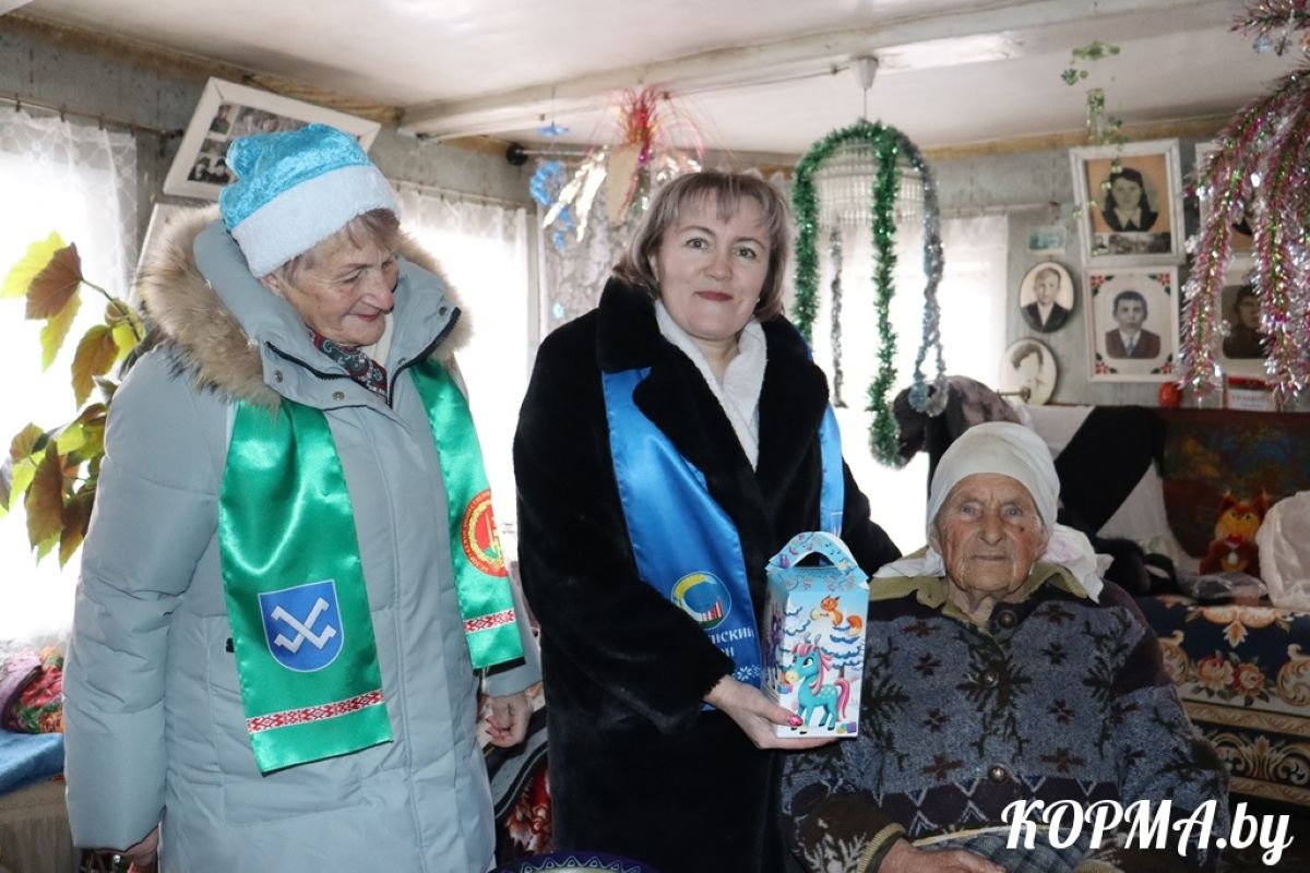 Со значимым юбилеем и Новым годом в рамках благотворительной акции «От всей души» именинниц поздравили председатель Кормянской районной профсоюзной организации Белорусского профсоюза работников АПК Елена Короедова, активист Кормянского районного Совета ветеранов Людмила Глаздовская и первый секретарь РК ОО «БРСМ» Анастасия Шмурадко.