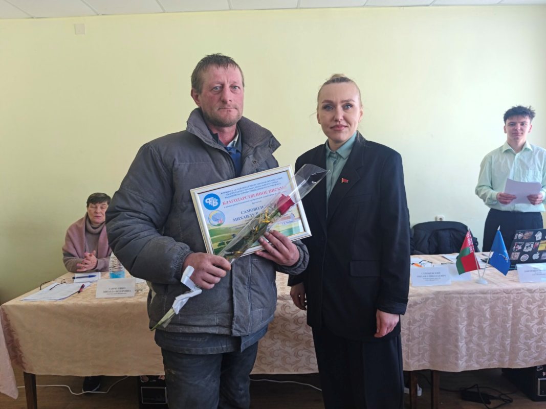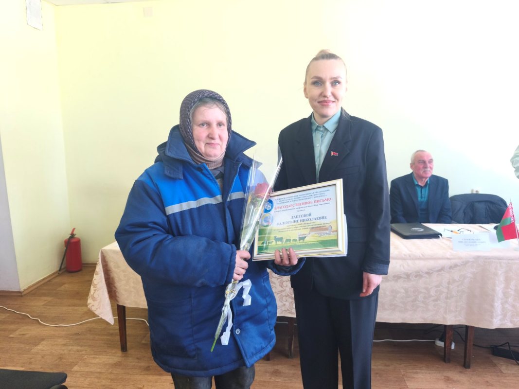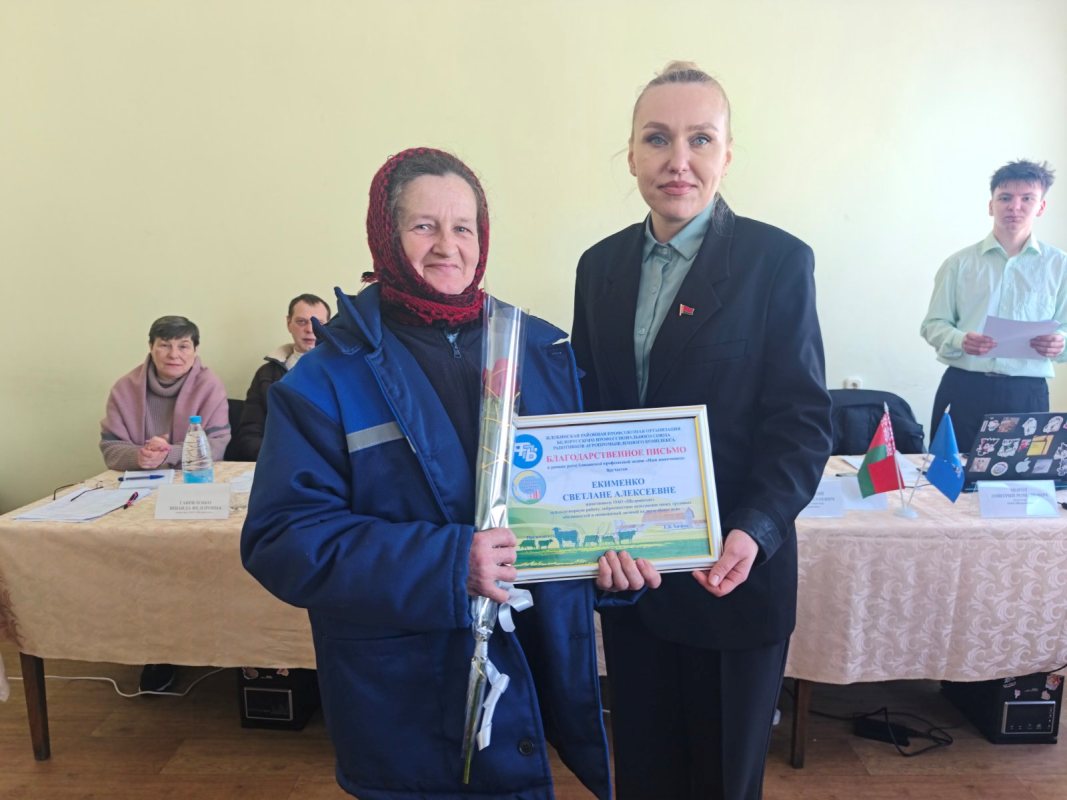 За многолетний добросовестный труд Почетную грамоту Гомельского областного комитета Белорусского профессионального союза работников агропромышленного комплекса Александр Гриньков вручил главному ветврачу Татьяне Поленок , бригадиру МТФ Надежде Муринчик, трактористу – машинисту Роману Щигельскому. Также в рамках акции «Наш животновод» были вручены благодарственные письма от Жлобинского районного комитета Белорусского профсоюза работников АПК — Валентине Лаптевой, Светлане Екименко, Михаилу Самольцеву.
