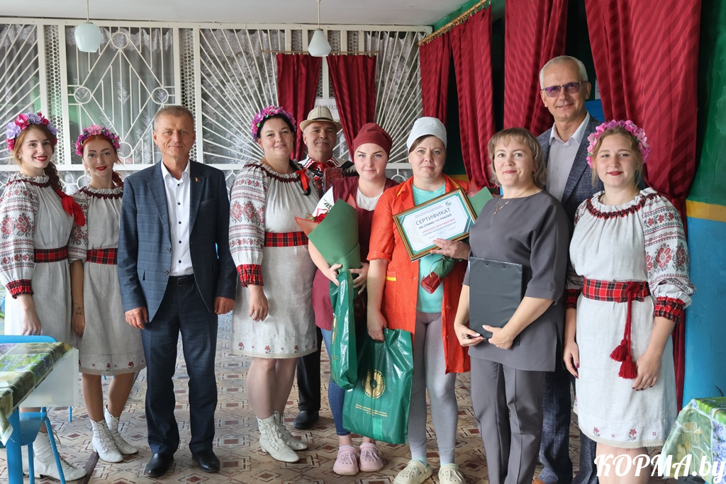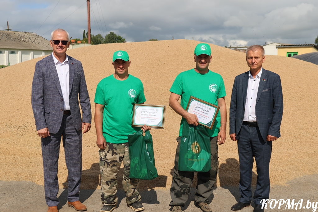 Председатель Белорусского профсоюза работников леса и природопользования Юрий Шумский и председатель Гомельской областной организации Белорусского профсоюза работников леса и природопользования Александр Василенко поздравили с высокими результатами, поблагодарили за труд и наградили денежными сертификатами и памятными подарками операторов зерносушильного комплекса КСУП «Совхоз «Кормянский» Виктора Богдановича и Александра Языкова, оператора зерносушильного комплекса ОАО «Кормаагросервис» Михаила Пинчукова, повара и работника столовой КСУП «Совхоз «Богдановичи» Алесю Ковалёву и Нину Ермоленко. Для каждого из них Юрий Иванович нашёл особые слова признательности, отметил их вклад в общее дело уборки урожая и обеспечения бесперебойной работы всех тружеников жатвы. И пусть в разгар страды традиционно чаще всего чествуют передовых комбайнеров и водителей, но всё же каждое звено, принимающее участие в уборке урожая, ценно и значимо. А встреча с Михаилом Геннадьевичем получилась особенно тёплой, так как он на протяжении 10 лет работал в лесном хозяйстве.