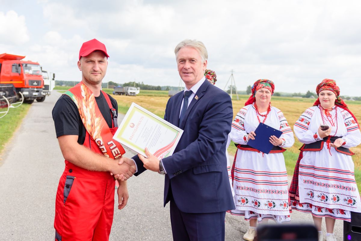 ПОКОРИТЕЛИ ТЫСЯЧНЫХ РУБЕЖЕЙ. ЧЕСТВОВАНИЕ ЭКИПАЖЕЙ КОМБАЙНЕРОВ, ПЕРВЫМИ НАМОЛОТИВШИМИ ТЫСЯЧУ ТОНН ЗЕРНА, ПРОШЛО В ЕЛЬСКОМ РАЙОНЕ