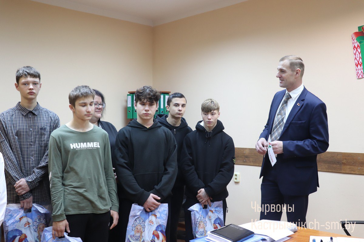 Всего в учреждении обучается одиннадцать несовершеннолетних ребят, по воле судьбы, оказавшиеся без попечения родителей. Председатель Октябрьской районной профсоюзной организации Белорусского профсоюза работников агропромышленного комплекса Ева Дервоед поздравила ребят с наступающим Новым годом и Рождеством, пожелала доброго здоровья, успехов в учебе и освоении навыков будущей профессии, стать профессионалами своего дела.