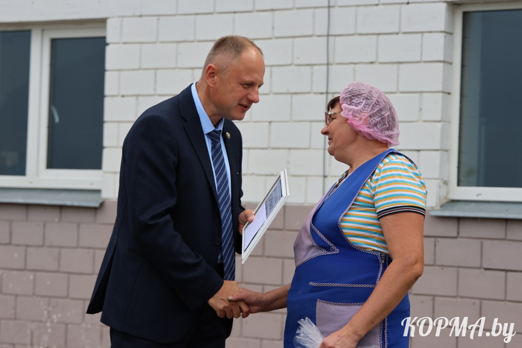 Заместитель председателя Белорусского профсоюза работников леса и природопользования Евгений Крискевич и председатель Гомельской областной организации отраслевого профсоюза Александр Василенко приехали, чтобы поблагодарить работницу кухни за качественное выполнение своих обязанностей и вклад, который она вносит в уборку урожая. Ведь от того насколько питательно, вкусно и сбалансировано будут питаться механизаторы и комбайнёры, зависит их работоспособность, а значит и темпы уборки урожая.