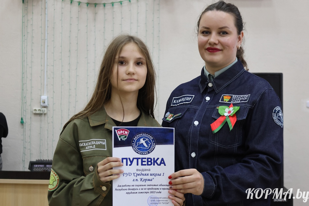 Важной частью открытия третьего трудового семестра — 2025 стало вручение первым секретарем РК ОО «БРСМ» Анастасией Шмурадко трудовых путевок командирам отрядов для работы на социально значимых объектах Кормянского района.