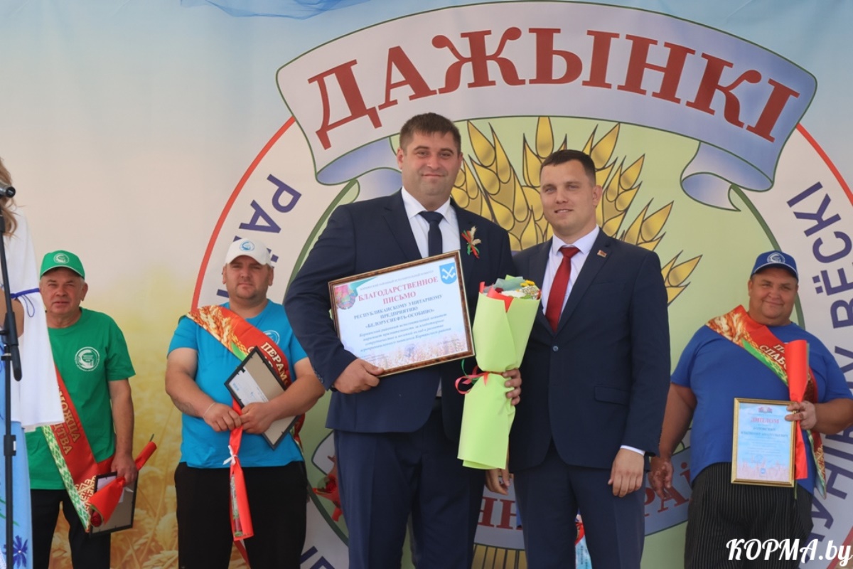 Благодарственное письмо Кормянского районного исполнительного комитета за внесение достойного вклада в весомый хлебный каравай Кормянского района вручено республиканскому унитарному предприятию «Белоруснефть-Особино» (директор Балабанович Николай Леонидович) и обществу с ограниченной ответственностью «Белпродукт» (директор Юросов Илья Семёнович).