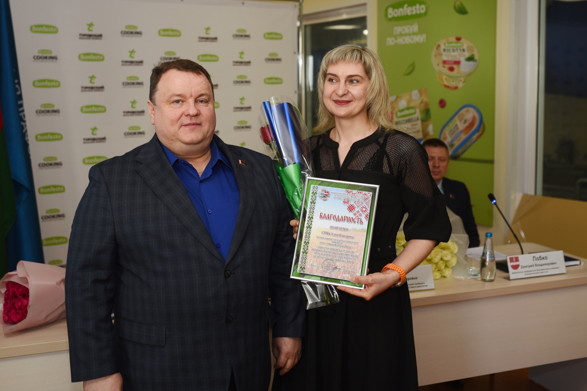 Председатель Житковичской районной профсоюзной организации работников Анатолий Ермакович поблагодарил за качественную организацию профсоюзного движения руководителя предприятия Ольгу Луцко и председателя профсоюзной организации Дарью Шкут.