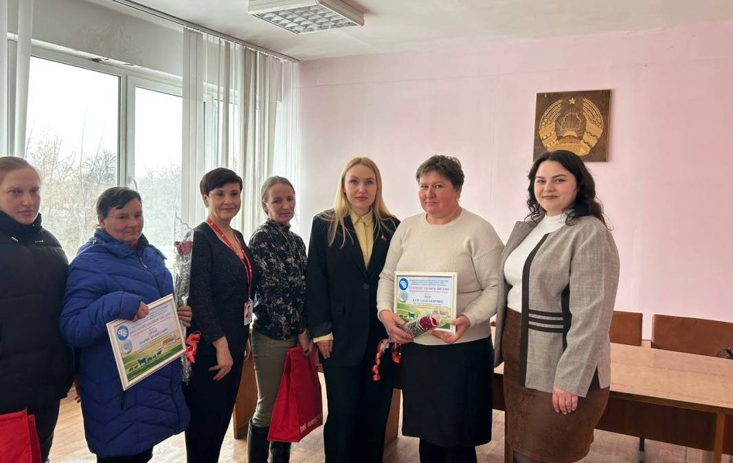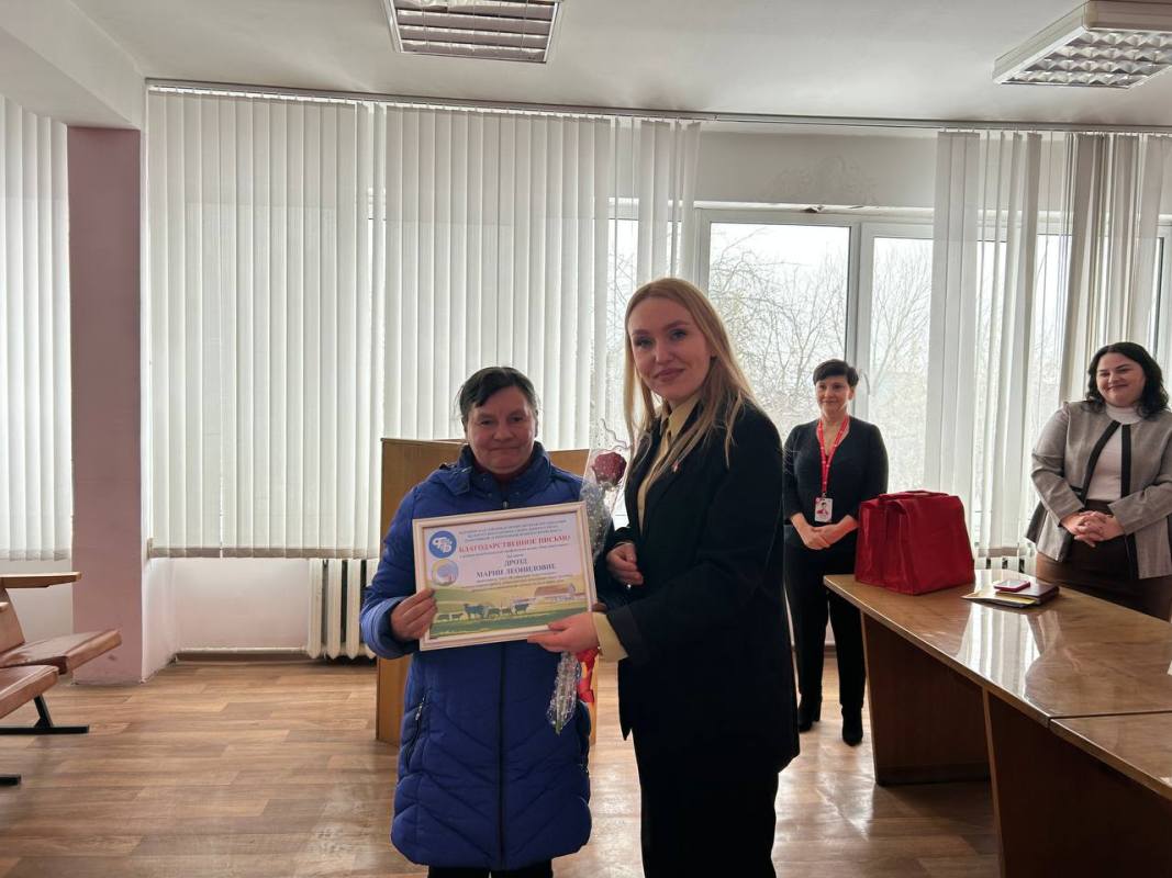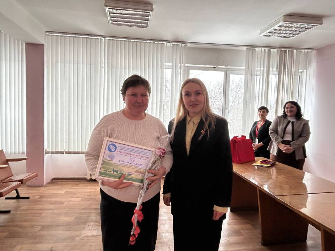 Председатель районной профсоюзной организации работников АПК Елена Хичёва поблагодарила животноводов за самоотверженный труд и вручила благодарственные письма от районной организации Алле Здор и Марии Дрозд.