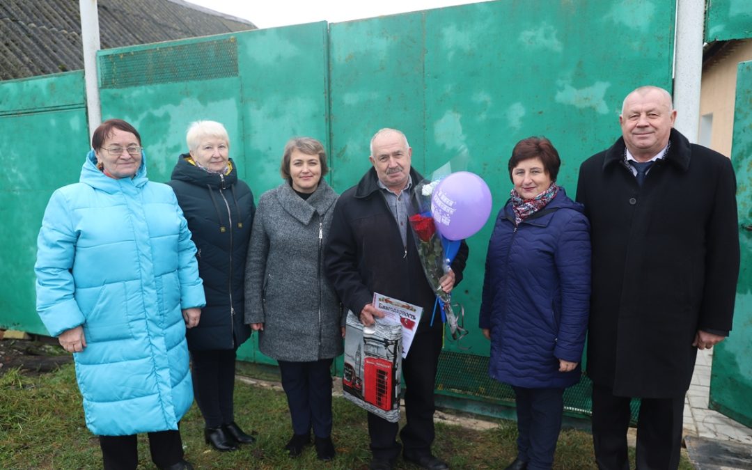 Поздравления с юбилеем и слова благодарности за многолетний добросовестный труд принимает ветеран труда из д. Липиничи Михаил Спасибов. Чествовать юбиляра приехали представители филиала ОАО «Гомсельмаш» «Юбилейный-Агро», председатель районной профсоюзной организации работников АПК Валентина Ксензова, председатель районного Совета ветеранов Александр Куриленко и ответственный секретарь ветеранской организации Мария Майсейкова.