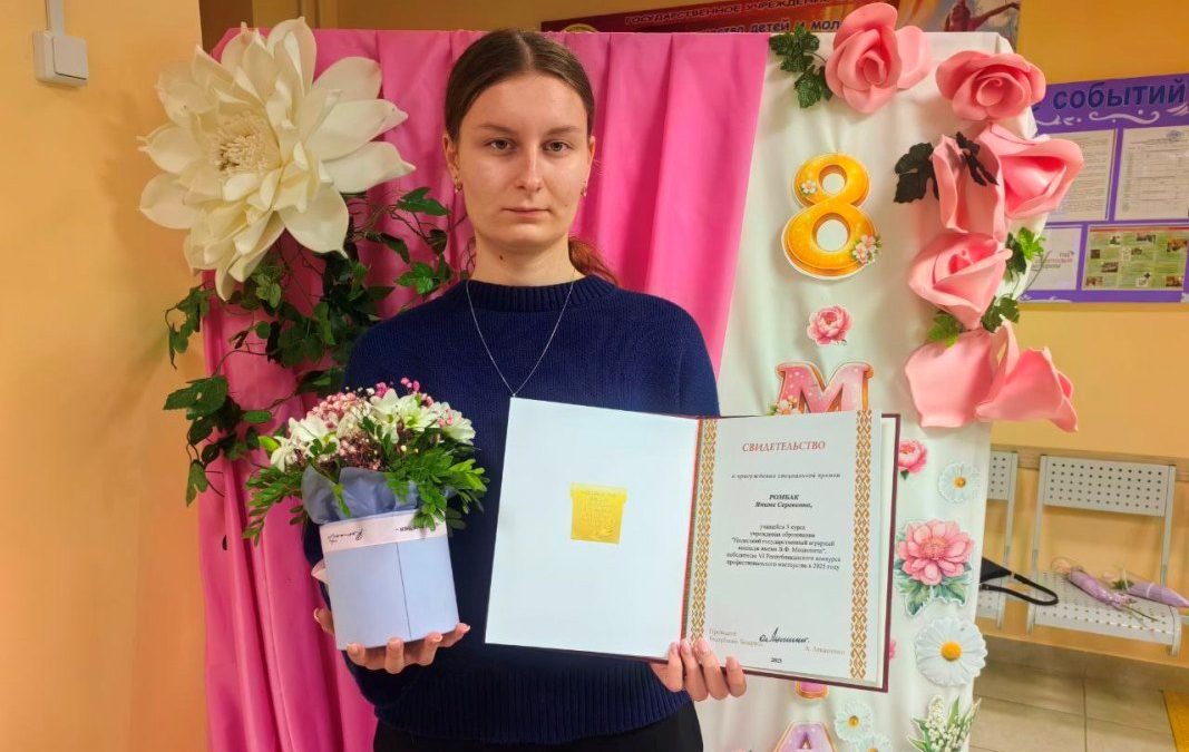 Успехи учащейся Полесского аграрного колледжа имени В.Ф.Мицкевича Янины Ромбак вновь отмечены на высоком уровне. В начале года за достижения в общественной и интеллектуальной деятельности она стала лауреатом премии облисполкома по поддержке талантливой молодежи.